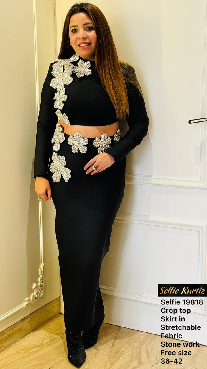 Selenay Crop Top & Skirt Set- Red, Orange, Black - Black / Free Size (upto 44) / Stone work