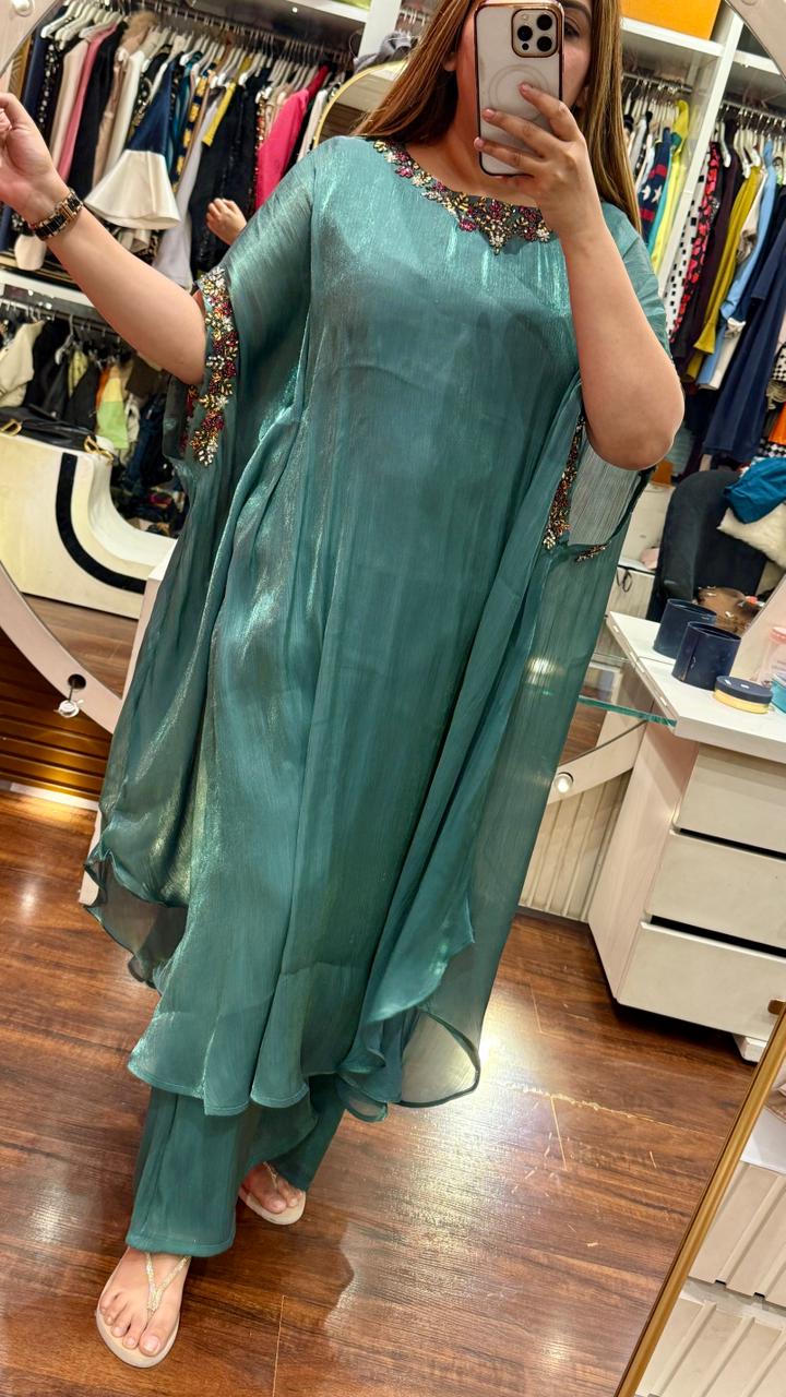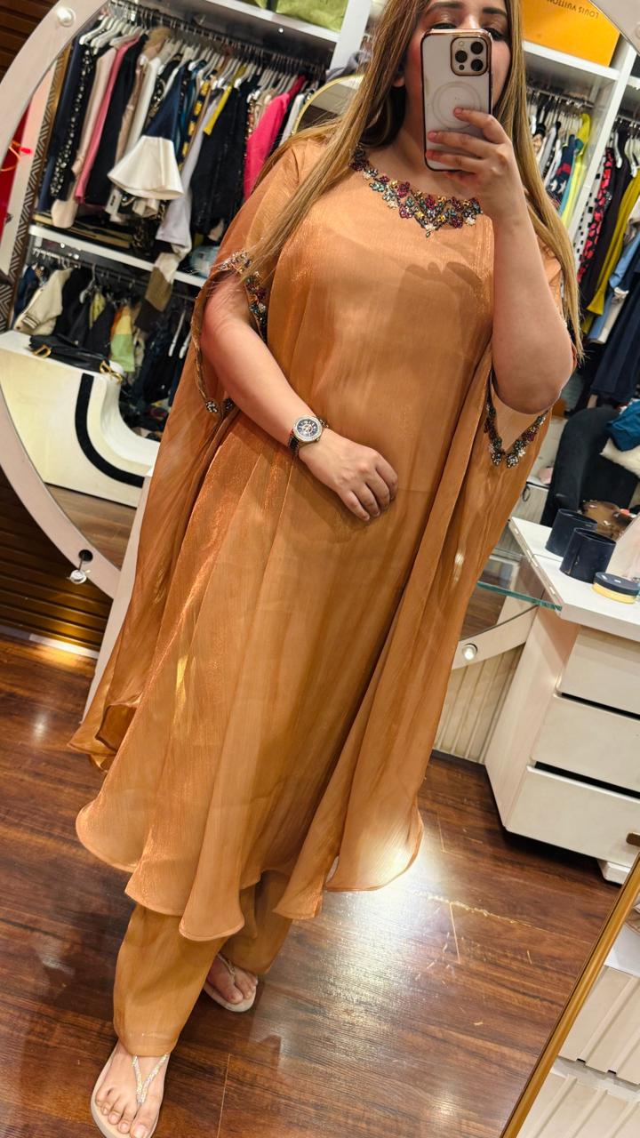 Mehvika Shimmer Kaftan Plazo Set- Brown, Pink, Green