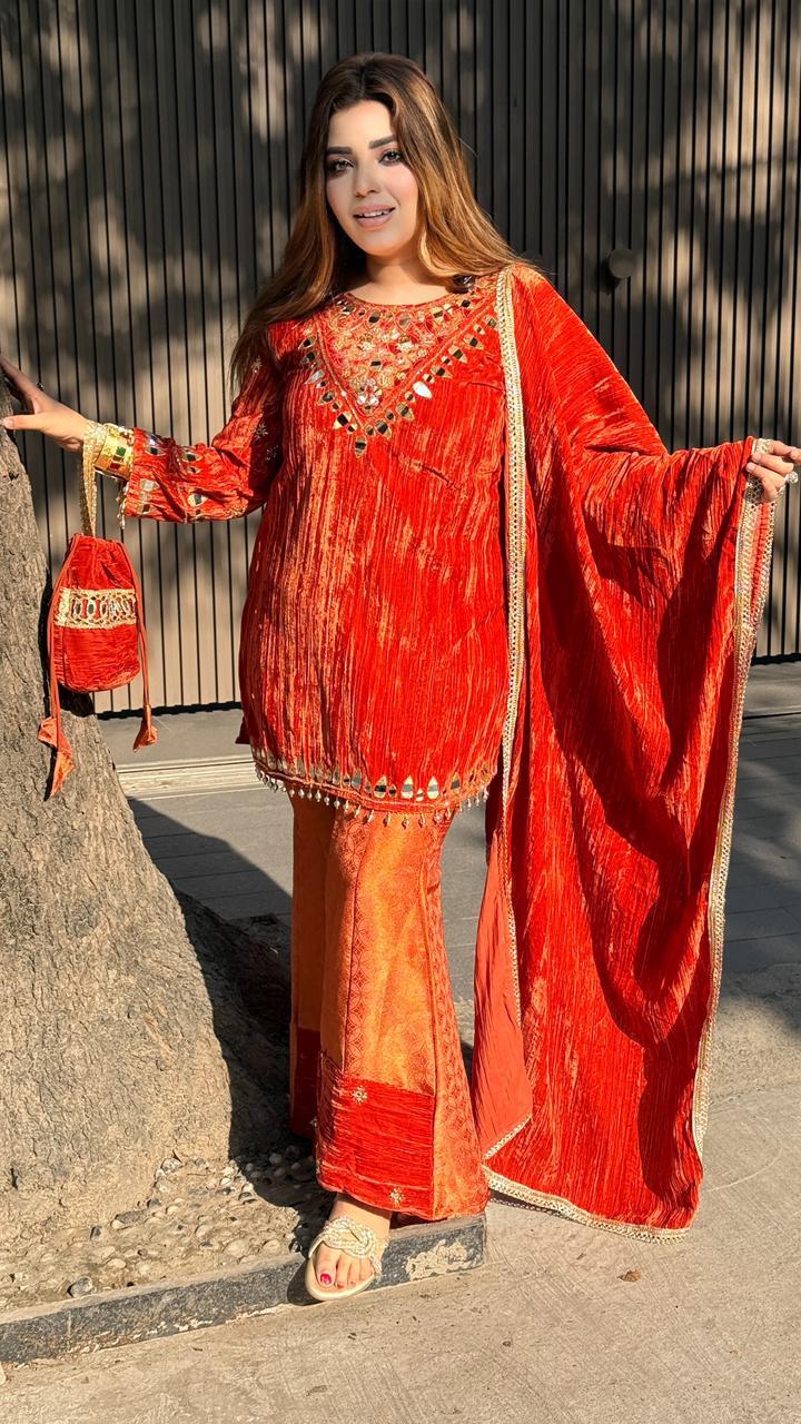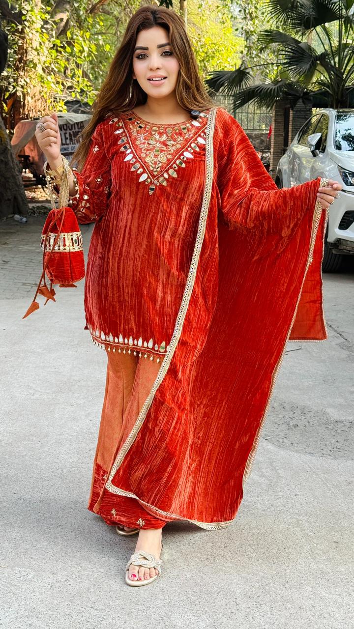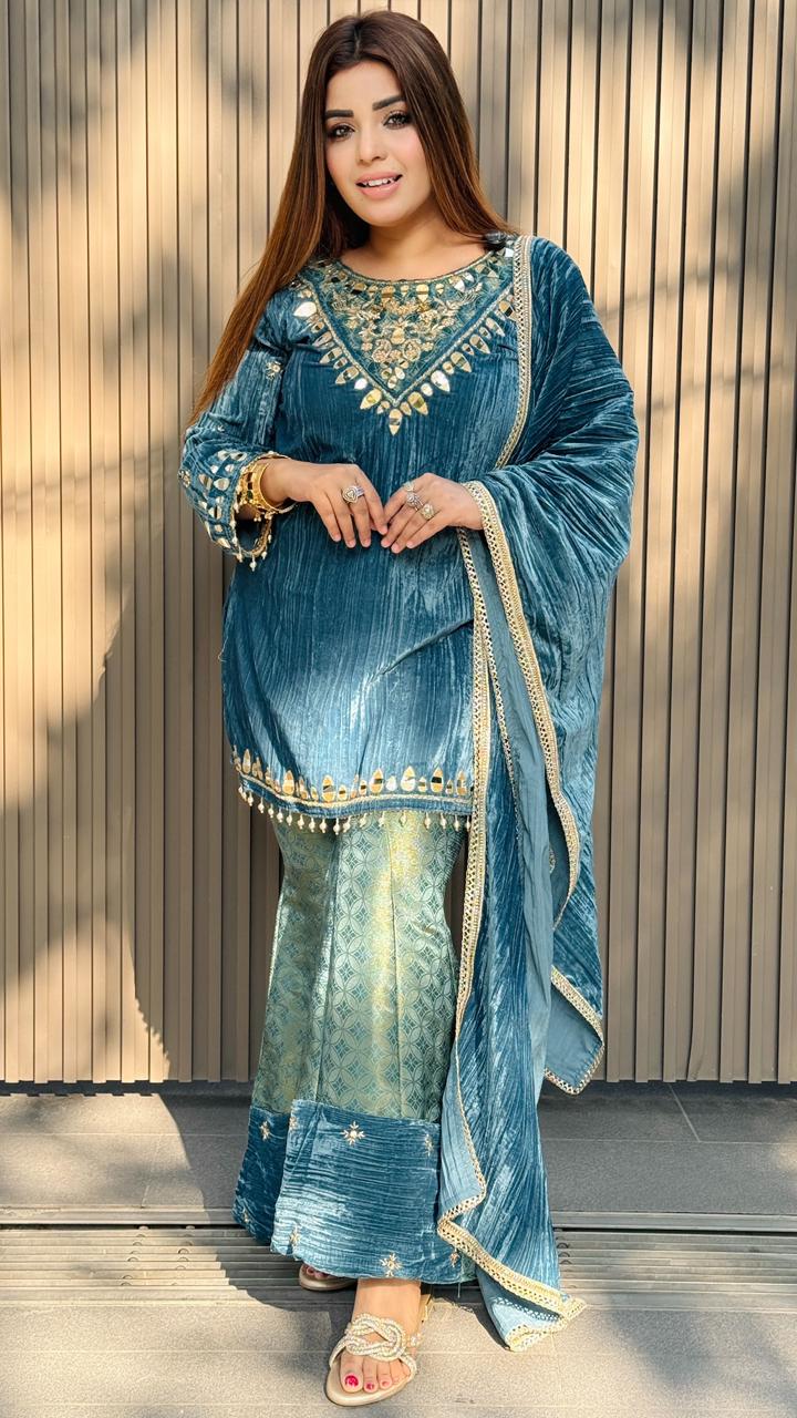 Mahjabeen Bell Plazo Suit- Blue, Orange - Blue / 40 / Velvet