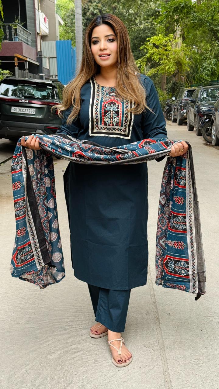 Saavika Cotton Suit Set- Orange, Navy