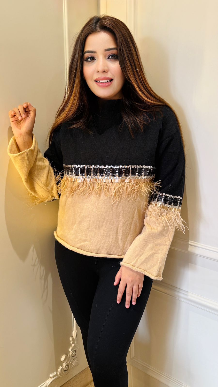 Sequine Woolen Sweater- Beige - Beige / Free Size (upto 44) / Wool