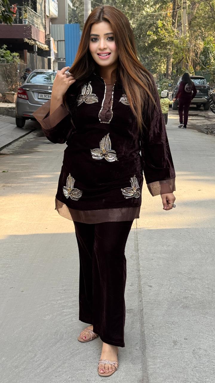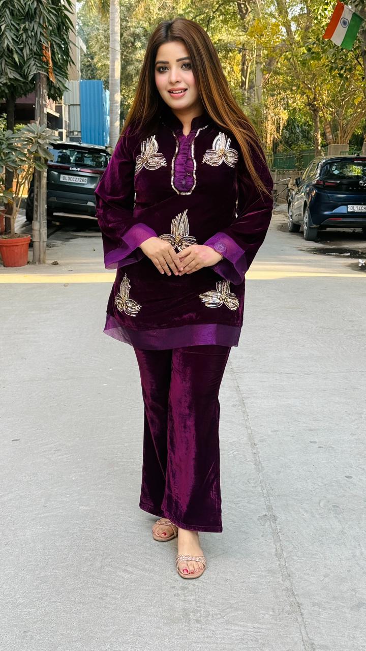 Vinara Bell Bottom Cordset – Wine, Brown - Purple / 40 / Velvet