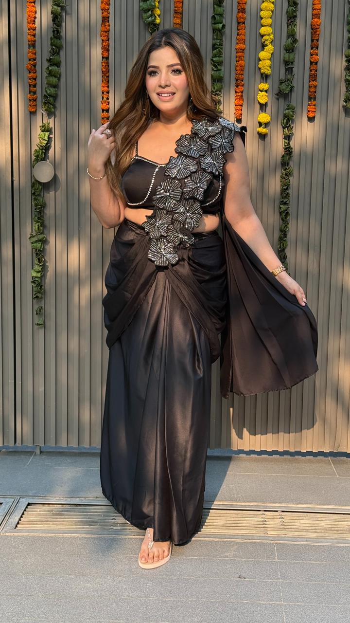 Mehika Drape Saree-Maroon, Pink, Black - Maroon / 40 / Satin